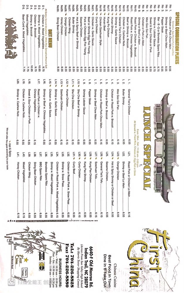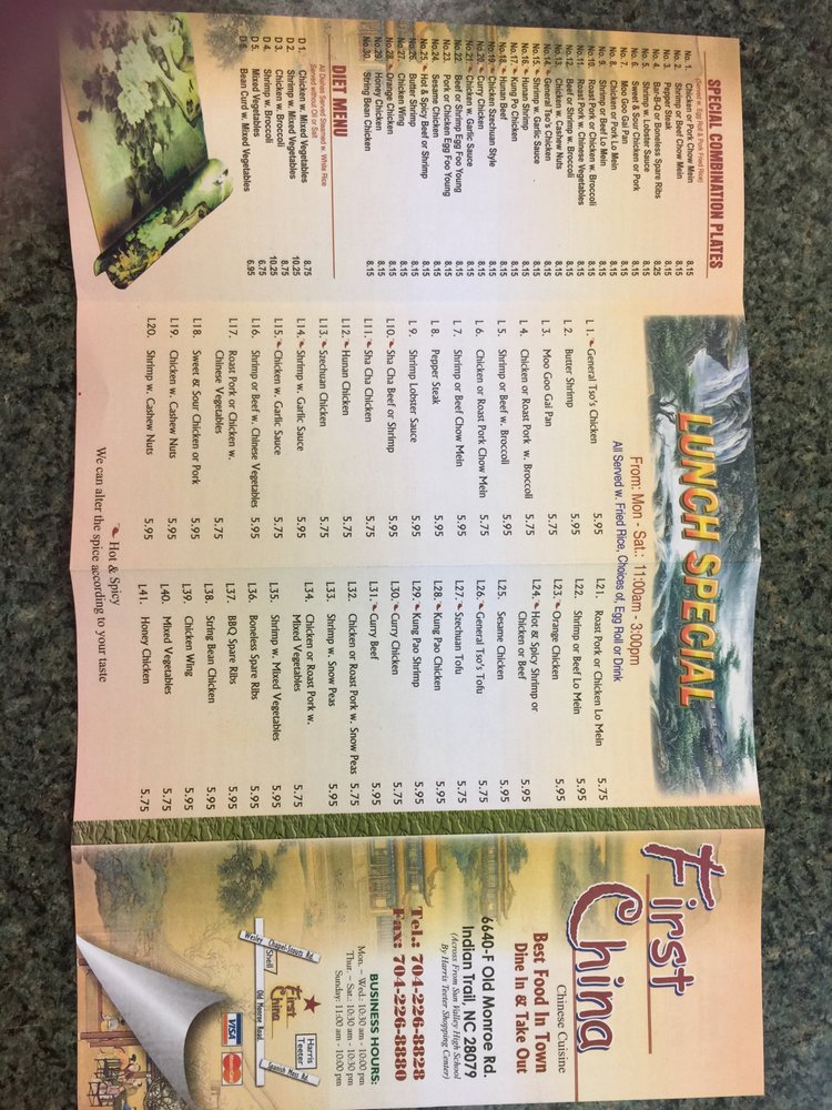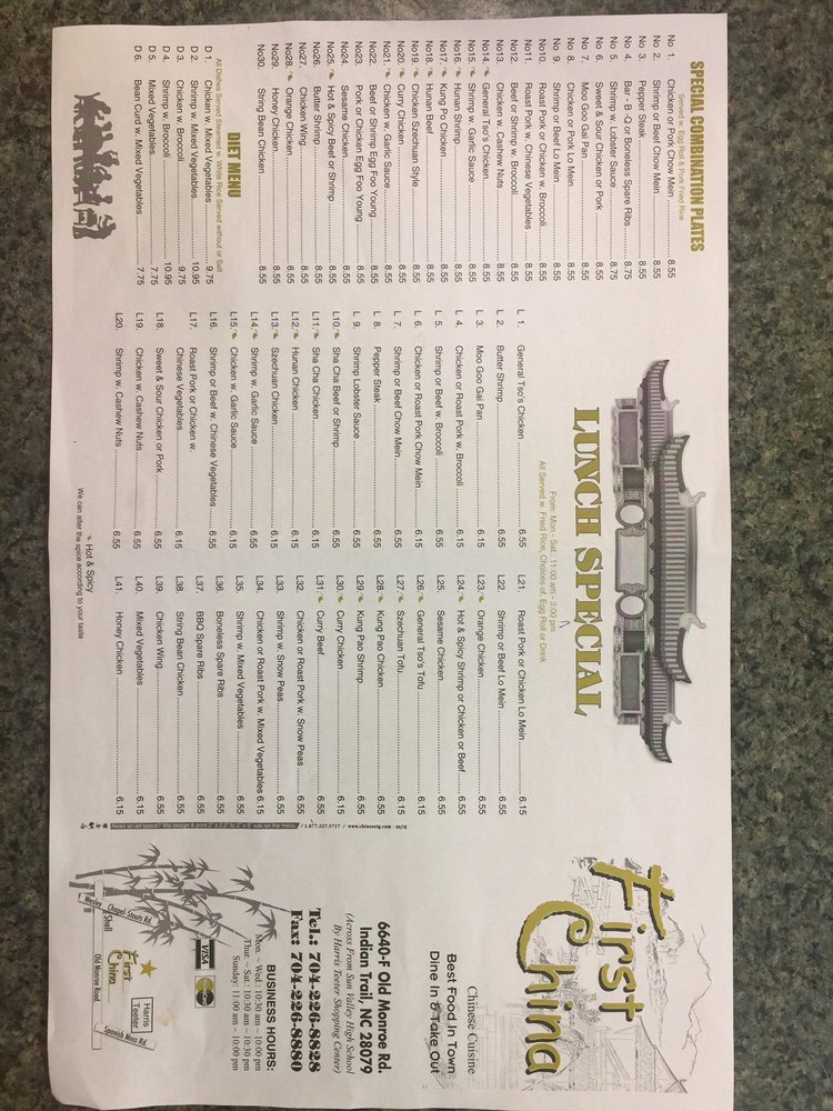 First China, located in Indian Trail, NC, offers a wide range of Chinese dishes with options for vegetarians. The restaurant provides a casual yet classy atmosphere, perfect for groups and families. Customers rave about the hot and sour soup, Singapore noodles, beef lo mein, orange chicken, and triple delight. The egg rolls, homemade mustard, and duck sauce add authenticity to the dining experience. Reviews consistently praise the consistently hot and fresh food, excellent service, and prompt takeout orders. With outdoor seating, Wi-Fi, and a cozy ambiance, First China delivers a delightful dining experience. Grab a taste of their flavorful dishes and experience the longstanding tradition of quality Chinese cuisine.